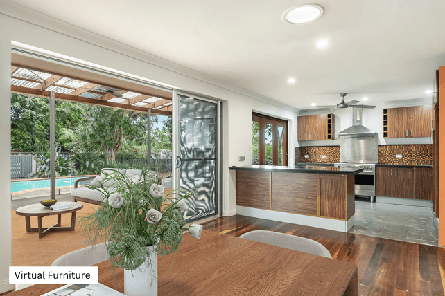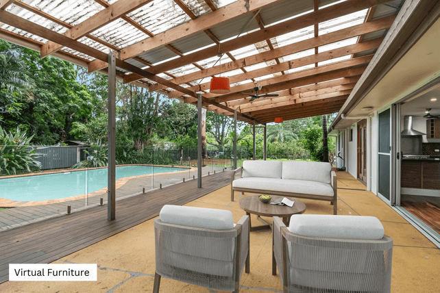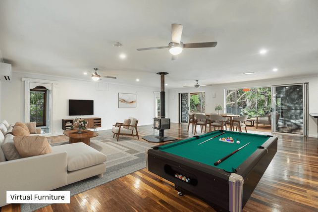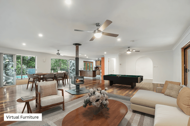 Main Residence: This beautiful family home with freshly painted exterior boasts a seamless indoor-outdoor flow, featuring four bedrooms, a study, and a spacious kitchen with gas cooking. Timber flooring elevates the living spaces, complemented by a cozy wood heater and reverse-cycle air conditioning. Step outside to a tropical haven with a sparkling pool surrounded by multiple outdoor living spaces for gatherings under the stars.