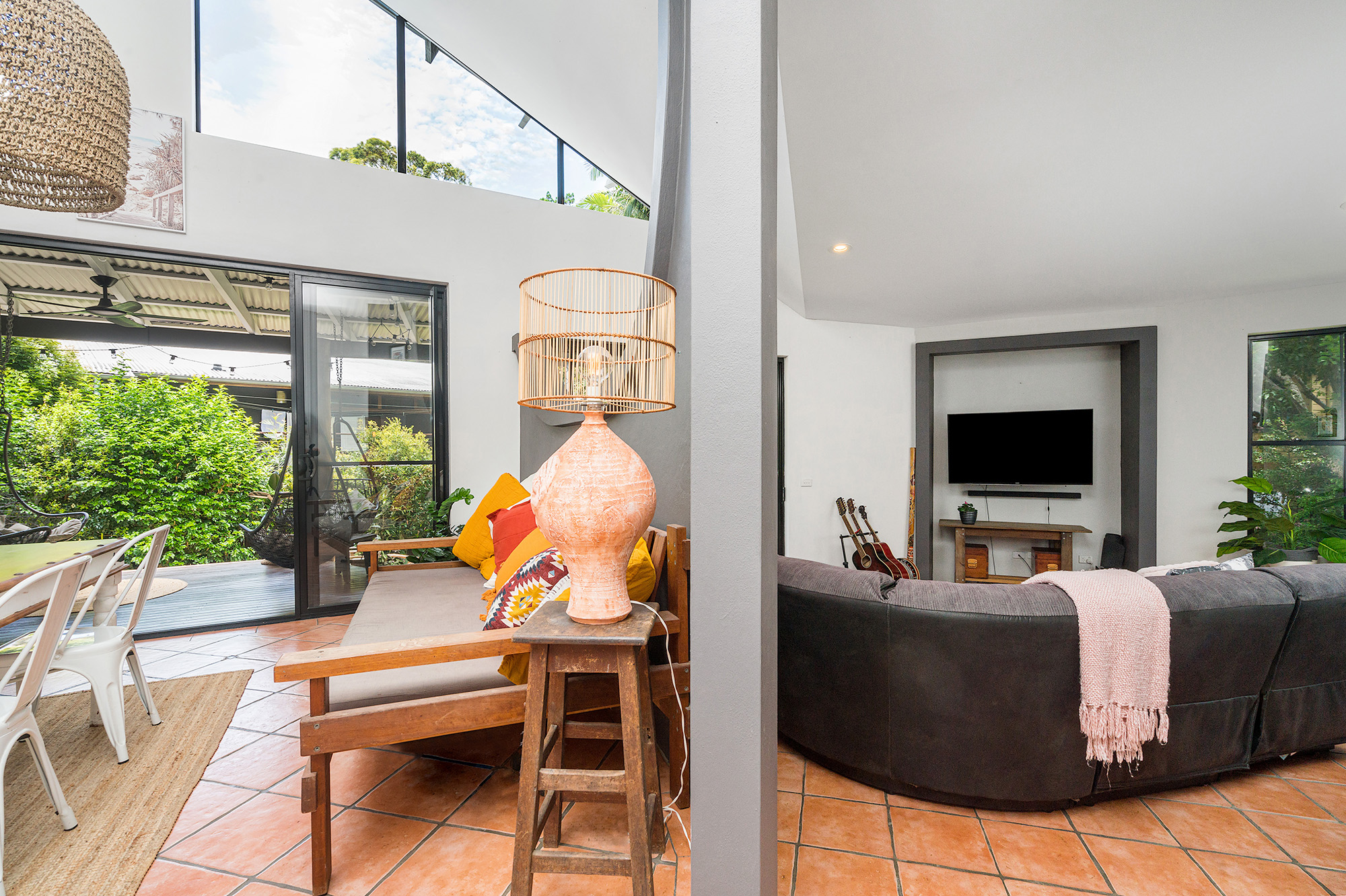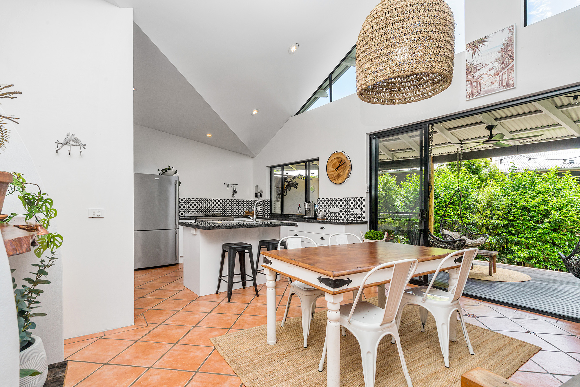 With raked windows, and ceilings up to 5 metres high, an abundance of natural light and breeze pour in through the renovated kitchen and dining area, which flow onto the beautiful north facing deck, where you'll enjoy your morning coffee surrounded by lush gardens whilst relaxing to the sound of birds.