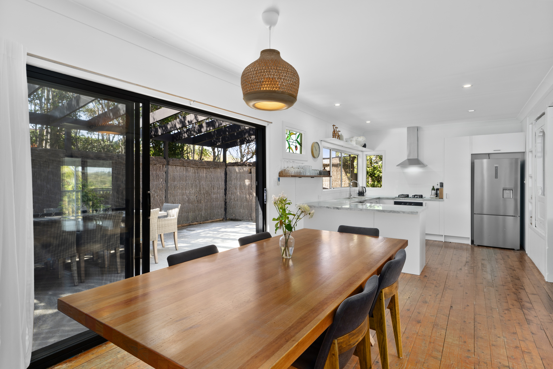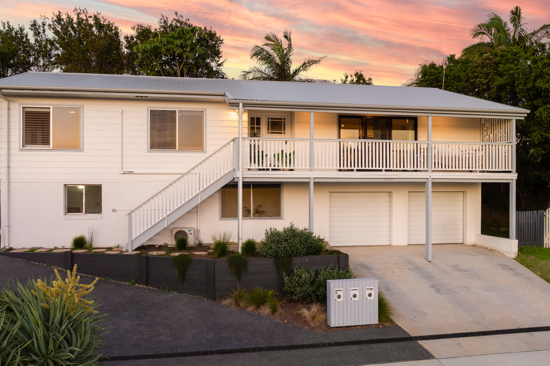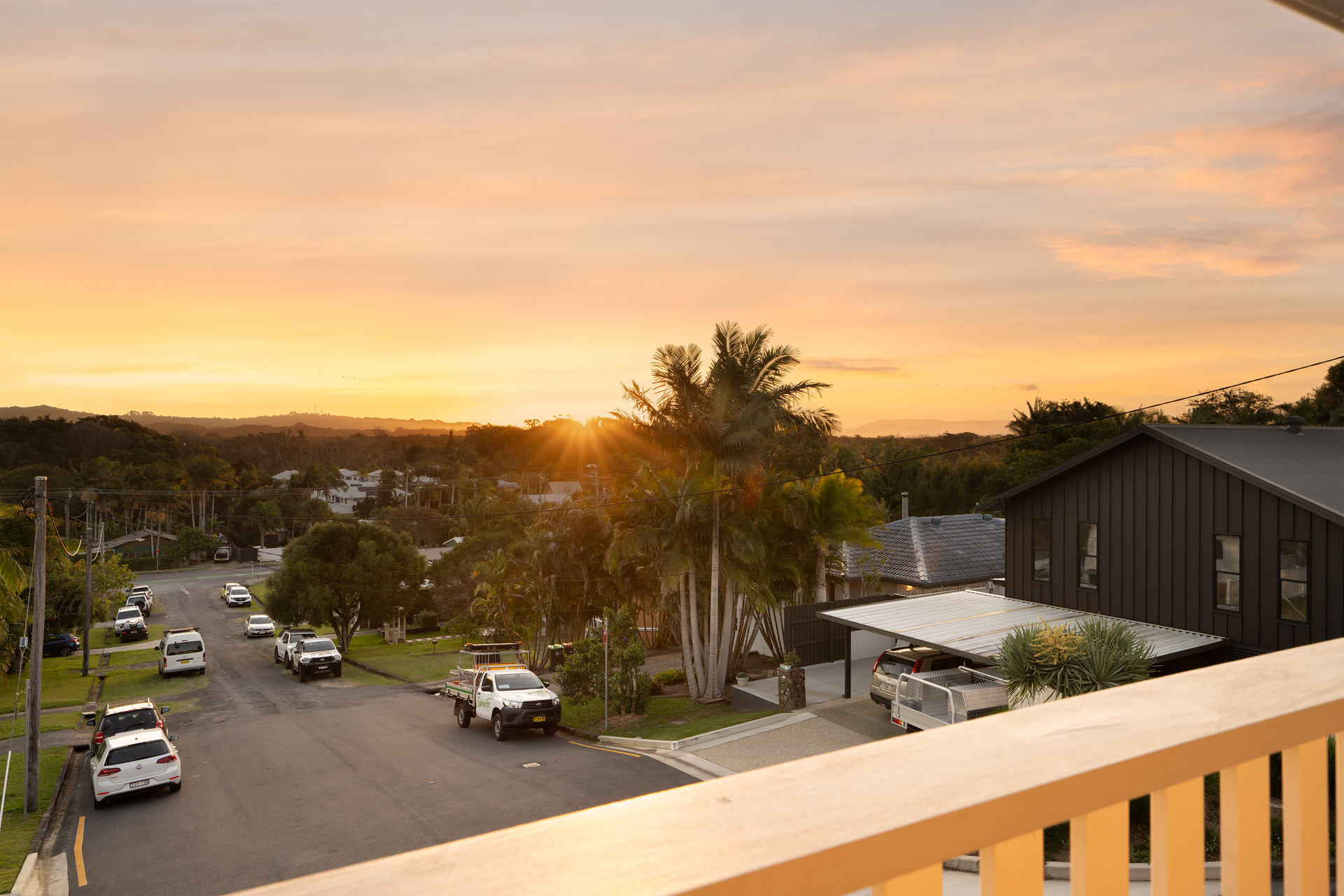 - Elevated three bedroom home in a coveted central Byron position - Enjoy the sweeping sunset views to the hinterland from the verandah - Light and airy open plan living area with classic timber floors and VJ panelling - Renovated kitchen features marble-look benchtops, gas cooking, Bosch dishwasher - Spacious dining room flows to the private entertainer's courtyard with leafy outlook - Three bedrooms with built-ins, fans and plantation shutters, bed 1 offers air con - Double lock-up garage, two storage areas offer versatility as a home gym or office space - Walk or cycle to Main or Clarkes Beach, 10 min stroll to the Jonson Lane complex - Moments to a network of bush tracks leading to beautiful Tallow Beach - Prime low-maintenance offering for investors, holiday makers or families