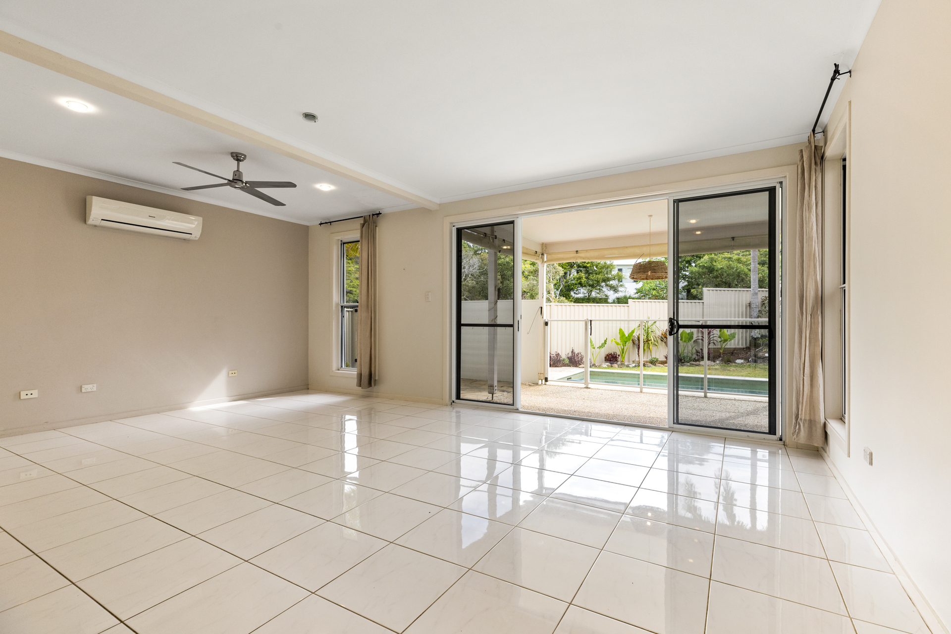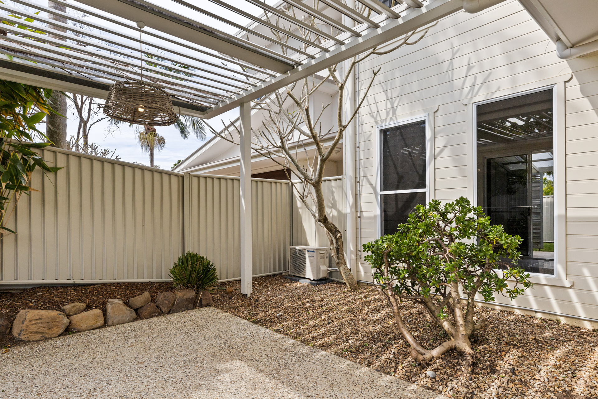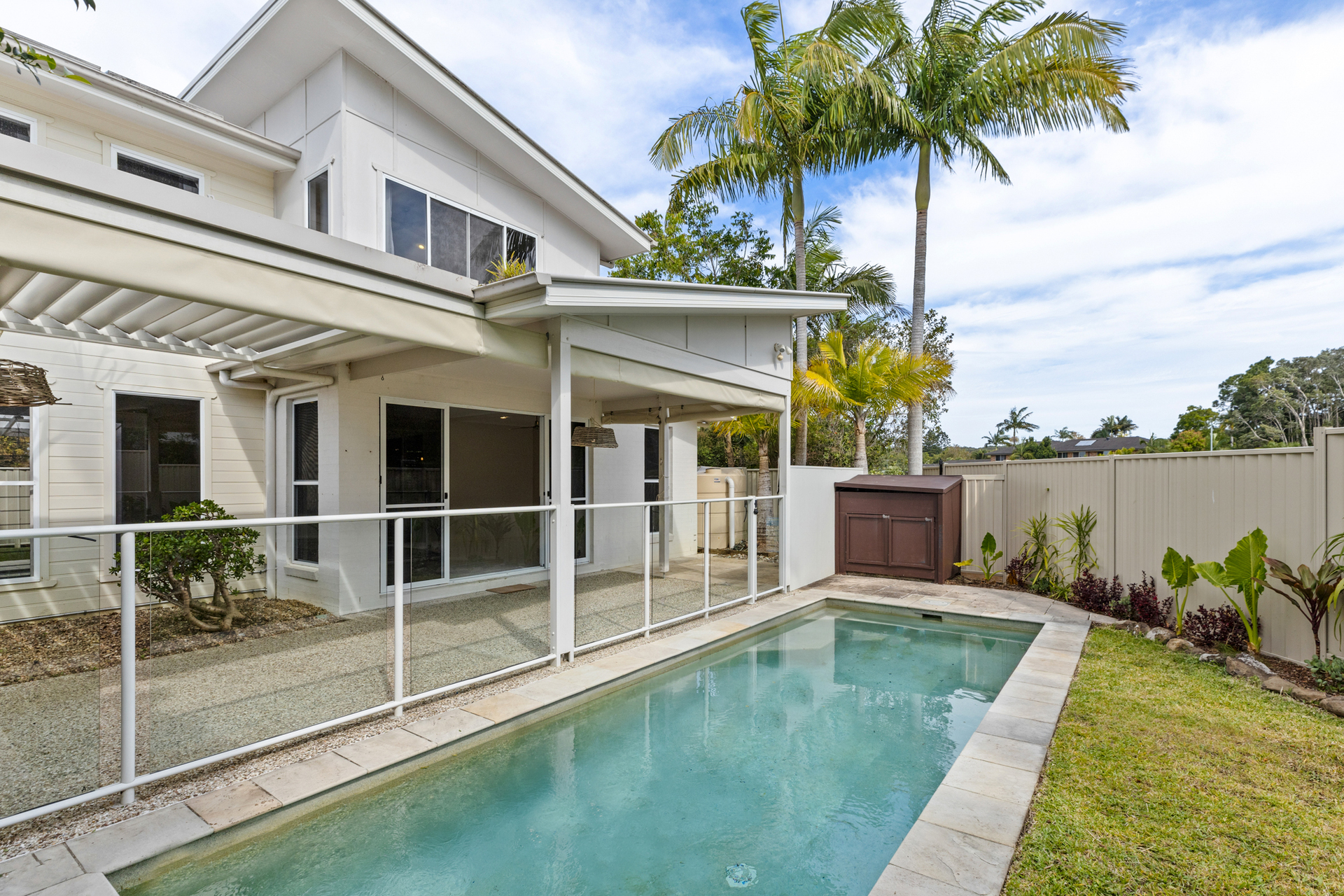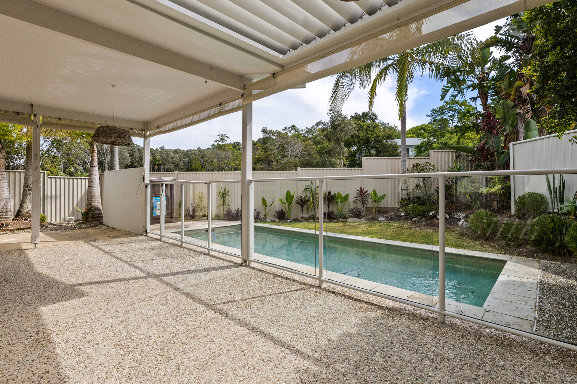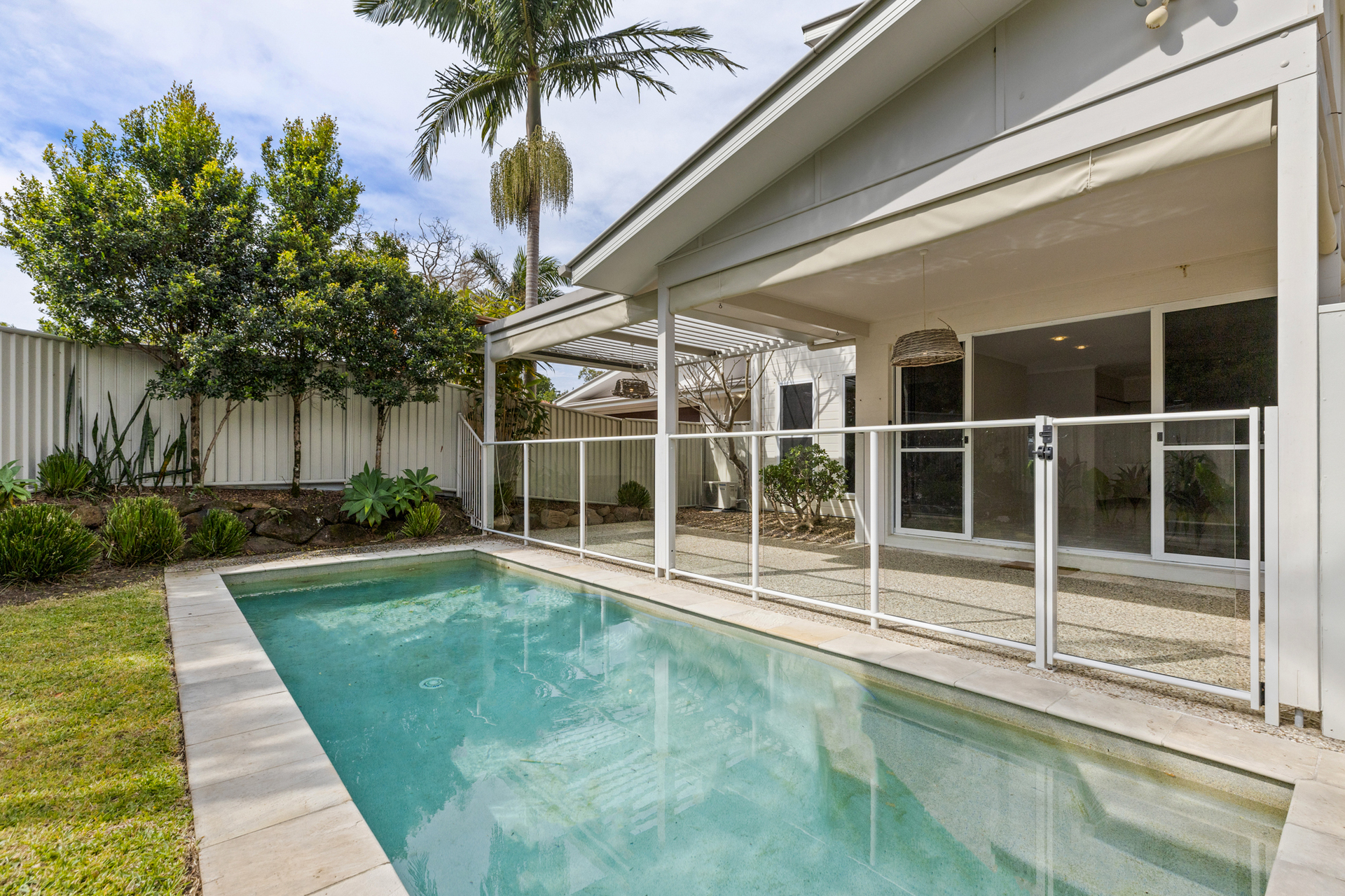 The fully fenced yard, framed by easy-care tropical gardens, is a private and secure space for pets and children. The pool area, complete with pergola, provides a serene and private oasis for soaking up the sun.