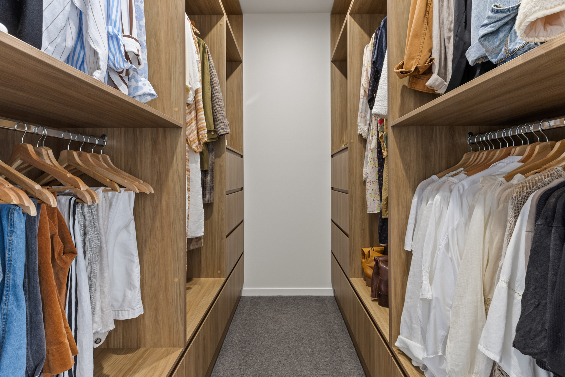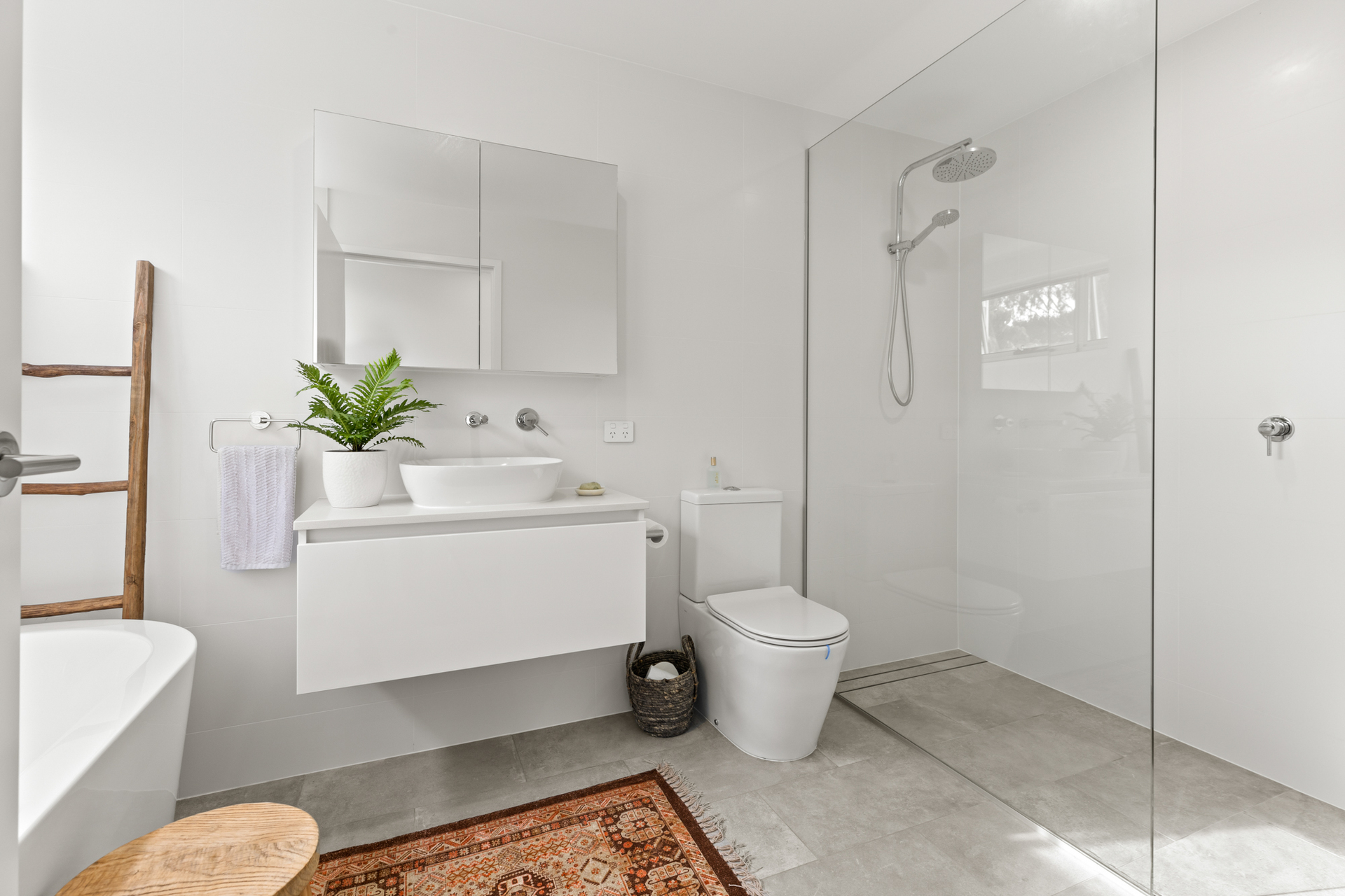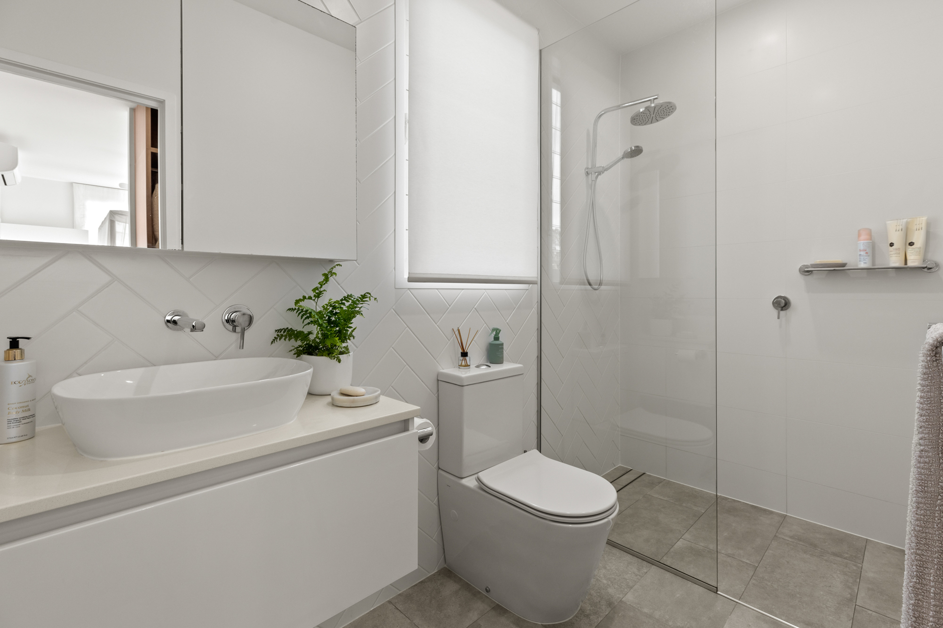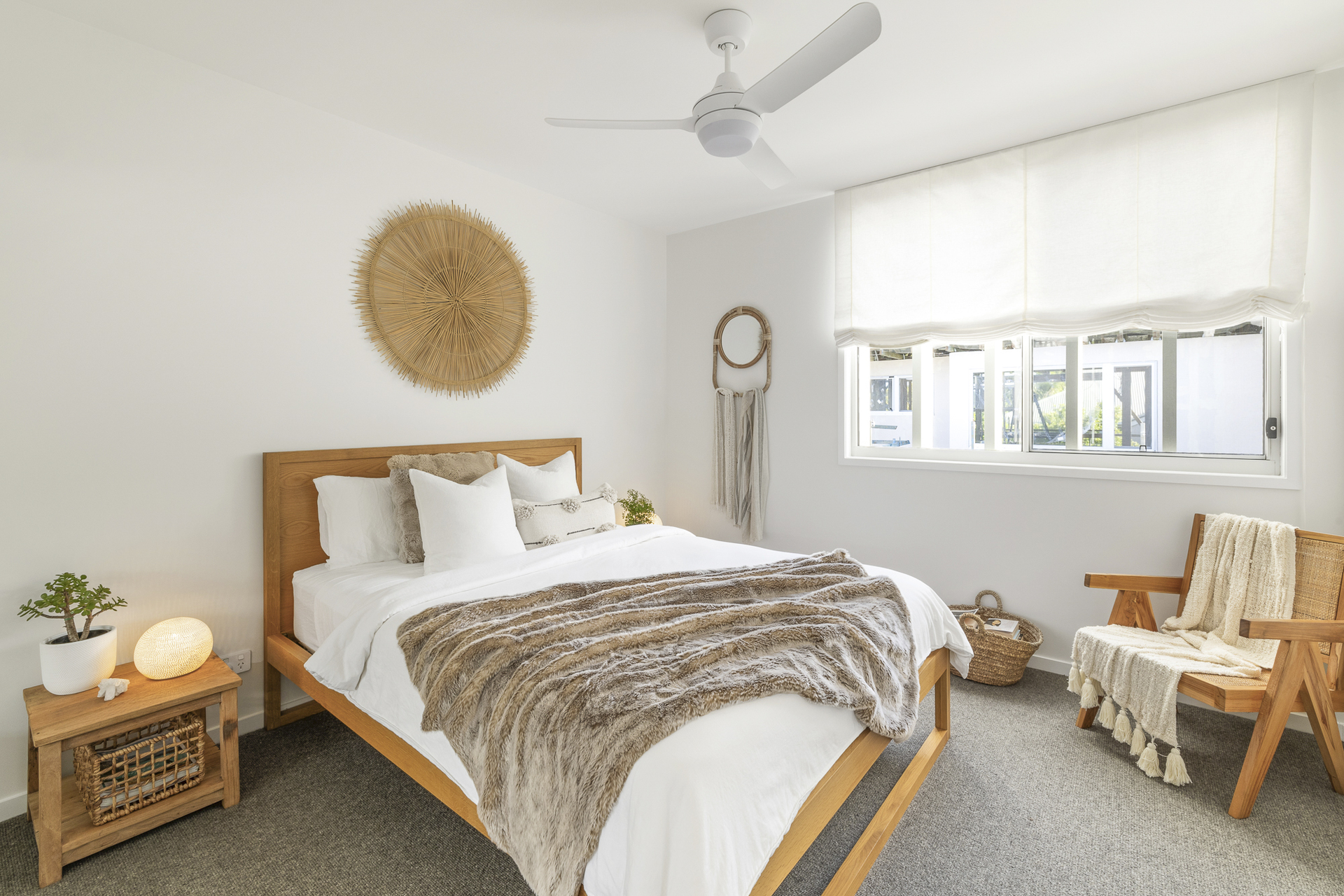 The residence features two bright and airy bedrooms. The main bedroom includes a modern walk-in robe and en-suite, while the second bedroom is equally light-filled and comes with built-in wardrobes. Both rooms are equipped with air conditioning and ceiling fans, ensuring comfort and convenience year-round.
